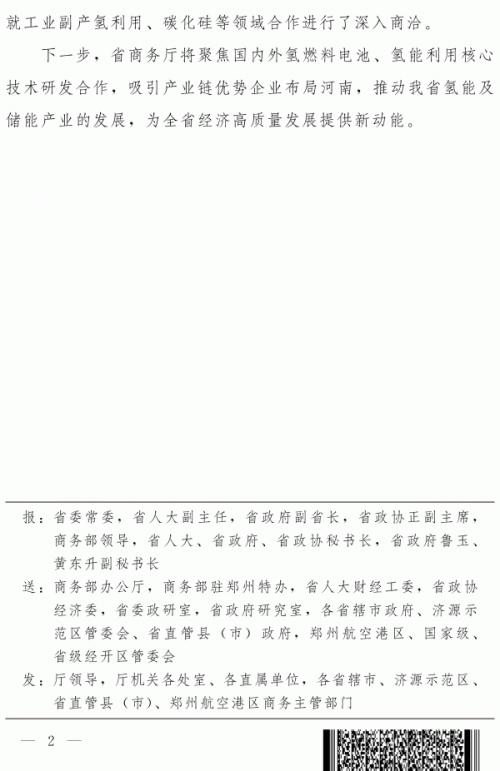 简报指出,河南全省年工业副产氢55万吨,郑州、新乡、濮阳等地初步形成产业集群。空气产品公司拟在郑州选址建设加氢站项目;上海申能环境与平顶山市政府、平煤神马集团就工业副产氢利用、碳化硅等领域合作进行了深入商洽。下一步,省商务厅将聚焦国内外氢燃料电池、氢能利用核心技术研发合作,吸引产业链优势企业布局河南。