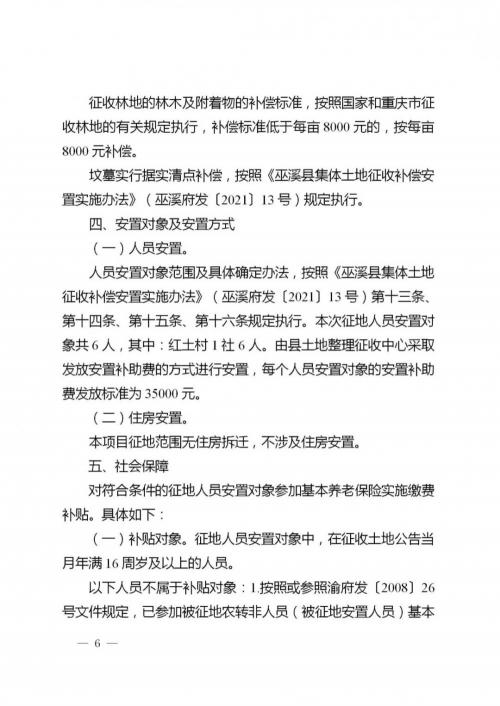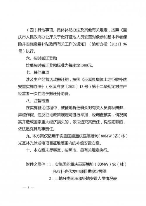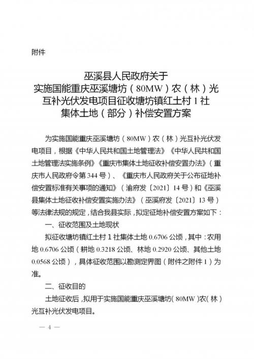 详见附件《巫溪县人民政府关于实施国能重庆巫溪塘坊(80MW)农(林)光互补光伏发电项目征收塘坊镇红土村1社集体土地(部分)补偿安置方案》。