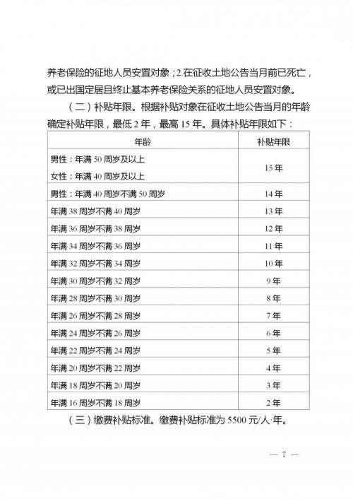 方案还提出,对符合条件的征地人员安置对象参加基本养老保险实施缴费补贴。具体如下: