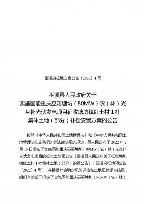 3月29日,巫溪县人民政府关于实施国能重庆巫溪塘坊(80MW)农(林)光互补光伏发电项目征收塘坊镇红土村1社集体土地(部分)补偿安置方案的公告。