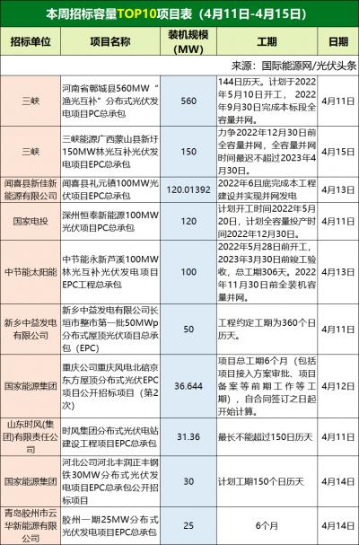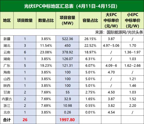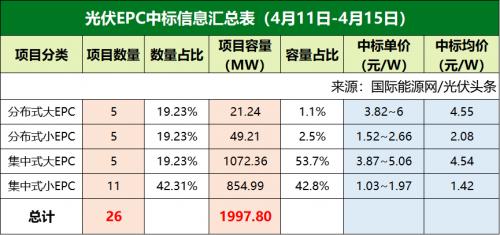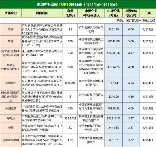 从中标项目的分类来看,本周大EPC项目为10个,装机容量为1093.6MW,中标价格落在3.82元/瓦~6元/瓦之间,均价为4.54元/瓦。
