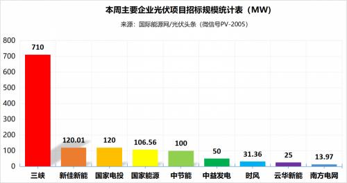 具体到本周的招标市场,三峡以容量710MW排名本周第一,闻喜县新佳新能源有限公司以120.01MW排名第二,国家电投则以120MW位居第三。