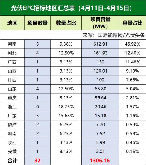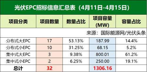 本周三峡、国家电投、国家能源集团、中节能等企业发布了32个光伏招标项目,装机规模合计1306.16MW。具体装机规模见下表。