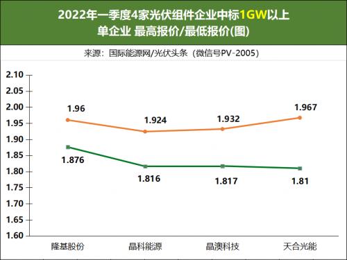 其中报价最低项目为1.876元/W,该项目为南网能源2022年第一批晶体硅光伏组件采购项目,隆基中标标包2,容量为160MW,投标报价30016万元。
