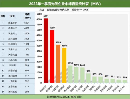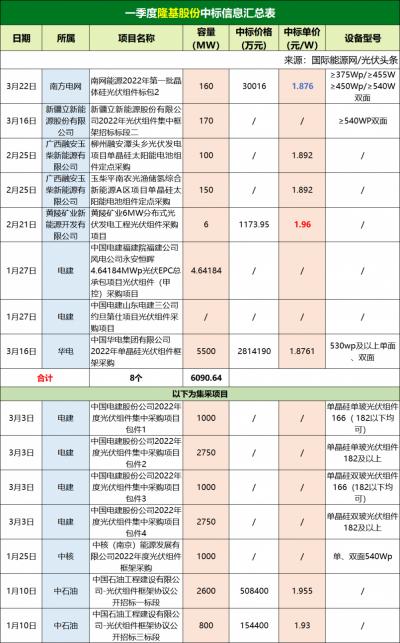 隆基股份作为光伏组件甚至是整个光伏行业的龙头,一季度表现亮眼,中标中国电建、华电集团、中核(南京)、中石油等企业的11个组件采购项目,确定中标容量6.09GW。