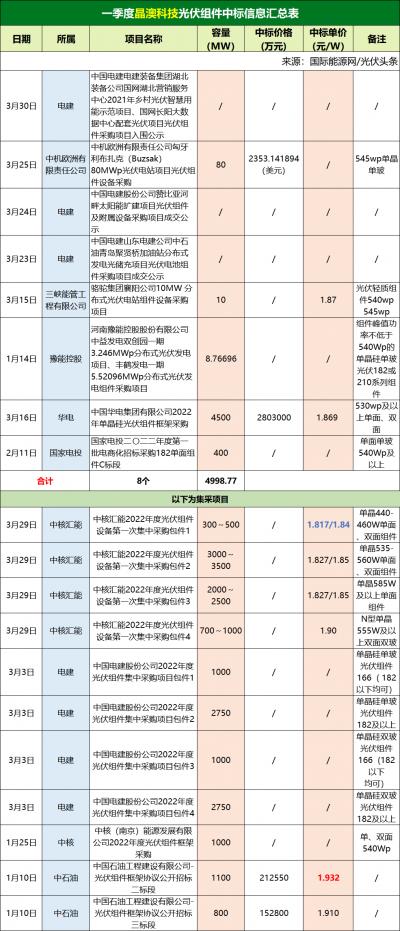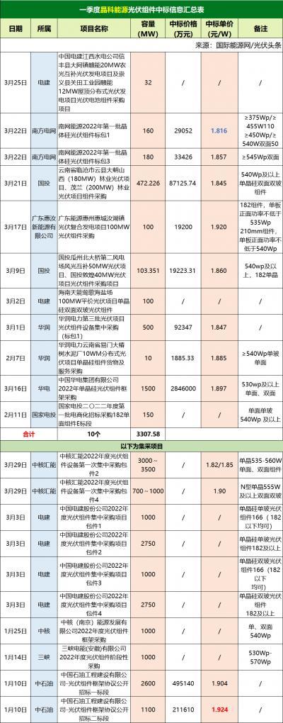 晶科能源一季度中标中国电建、华润集团、华电集团、南方电网、国家电投等企业15个项目,确定中标容量为3.3GW。