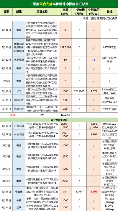 一季度,天合光能中标中国电建、水发能源、国家电投、华电集团、中核汇能等11个组件招标项目,确定中标容量为1.46GW。