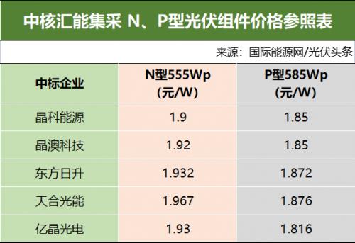 中标价格方面N型组件价格最低为中核汇能集采项目晶科能源投出的1.9元/W,国家电投集采项目均价高达2.079元/W。与P型组件价格相比,N型组件价格还处在高位。