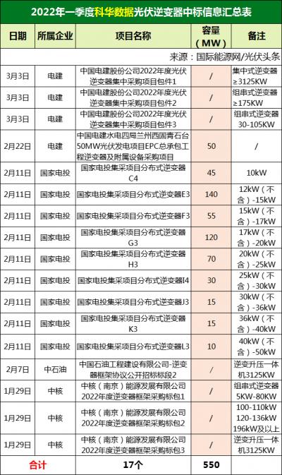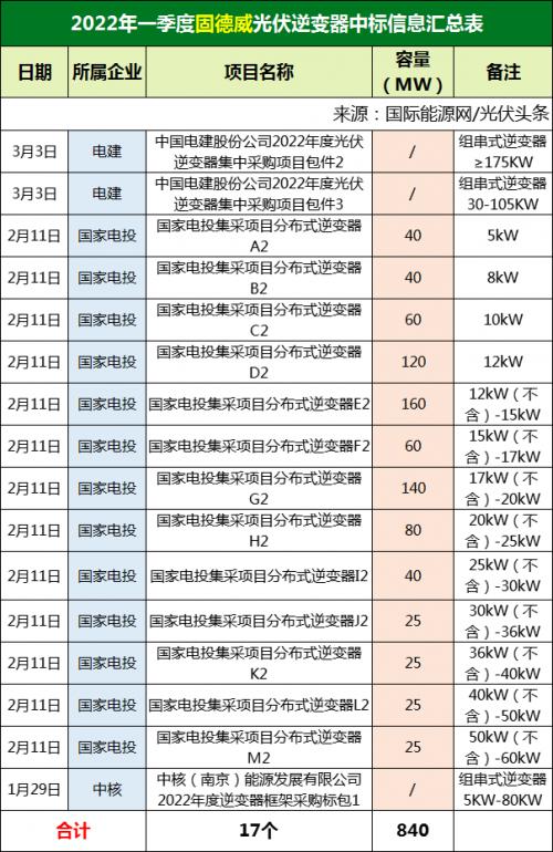 值得关注的是,由于一季度逆变器定标项目多为集采项目,除国家电投确定了各个企业的中标容量之外,多数项目没有确定中标企业的中标容量。