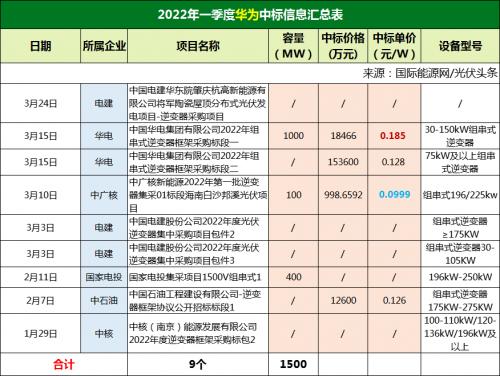 除此之外,中广核新能源2022年第一批逆变器集采01标段海南白沙邦溪光伏项目,招标容量100MW,华为作为中标人,投标报价998.6592万元,折合单价0.0999元/W,是华为最低价中标项目。