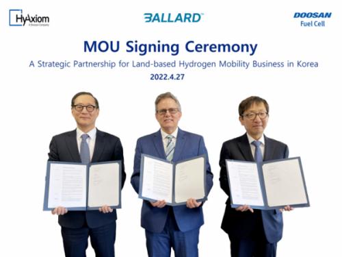 4月27日,巴拉德动力系统、韩国斗山燃料电池公司和斗山北美的全资子公司HyAxiomqi在美国康涅狄格州的HyAxiom总部签署谅解备忘录,建立了战略合作伙伴关系,将开发最初主要集中于韩国市场的质子交换膜氢燃料电池车载应用。