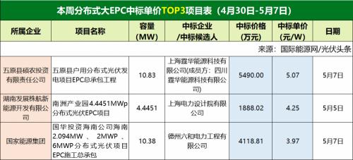 本周分布式大EPC中标单价TOP3项目分别是五原县户用分布式光伏发电项目EPC总承包工程、南洲产业园4.4451MWp分布式光伏EPC项目、国华投资海南公司海南2.094MW、2MWP、6MWP分布式光伏项目EPC施工总承包。项目所属企业有五原县硕农投资有限责任公司、湖南发展株航新能源开发有限公司、国家能源集团,项目中标单价最高5.07元/W,最低3.97元/W。