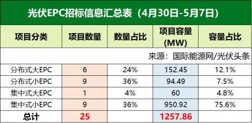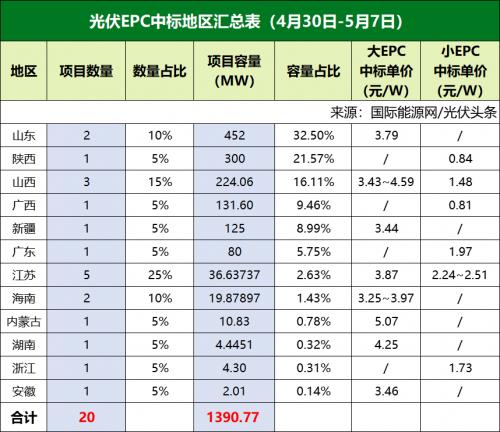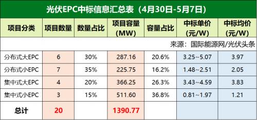 从中标项目类别来看,分布式大EPC项目有6个,数量占比为30%,项目容量为287.16MW,容量占比为20.6%,中标单价区间在3.25~5.07元/W之间,中标均价为3.97元/W。