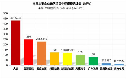 本周大唐、国家能源集团、广州发展等企业发布了20个中标项目结果,总规模1390.77MW。其中,大唐以431.6045MW位居第一,兰陵县茂源国能新能源有限公司以250MW位居第二,国家能源集团以228.5419MW位居第三。