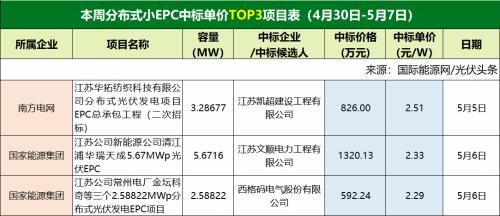 本周分布式小EPC中标单价TOP3项目分别是江苏华拓纺织科技有限公司分布式光伏发电项目EPC总承包工程(二次招标)、江苏公司新能源公司清江浦华瑞天成5.67MWp光伏EPC、江苏公司常州电厂金坛科奇等三个2.58822MWp分布式光伏发电EPC项目。项目所属企业有南方电网、国家能源集团,项目中标单价最高2.51元/W,最低2.29元/W。