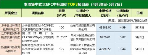 本周集中式大EPC中标单价TOP3项目分别是乡宁县西交口乡10万千瓦光伏发电项目EPC总承包、国信扬电厂区21.2387MWp光伏发电项目EPC总承包、陕投木垒光伏园区125兆瓦光伏发电项目EPC总承包工程。项目所属企业有乡宁县贝林清洁能源有限公司、江苏新能昊扬新能源发展有限公司、新疆陕投新能源有限公司,项目中标单价最高4.59元/W,最低3.44元/W。