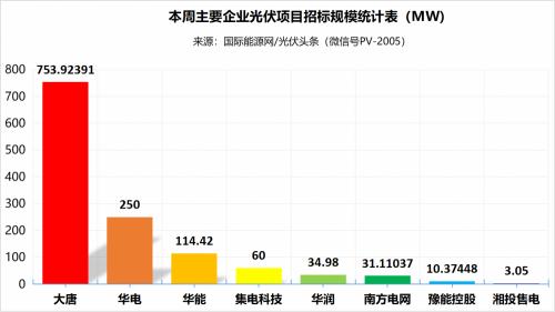 本周大唐、华电、华能等企业发布了25个光伏招标项目,装机规模合计1257.86MW。具体到本周的招标市场,大唐以容量753.92391MW,排名本周第一。华电以250MW,排名第二。华能则以114.42MW位居第三。具体装机规模见下表。