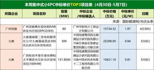 本周集中式小EPC中标单价TOP3项目分别是广州发展惠东梁化80MW农业光伏项目EPC总承包、大唐蒲城第二发电有限责任公司大唐蒲城洛滨300兆瓦农光互补发电项目、广西桂冠平果市果化镇和太平镇农光互补光伏发电项目(100MW)。项目所属企业有广州发展、大唐,项目中标单价最高1.97元/W,最低0.81元/W。