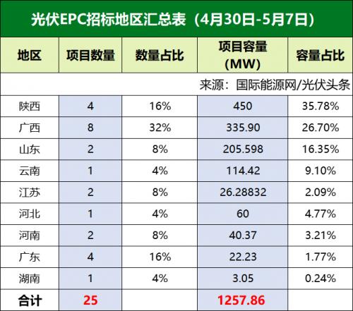 本周25个招标项目,分布于陕西、广西、山东、云南、江苏、河北、河南、广东、湖南等9地。其中陕西以规模450MW排名第一,广西以335.90MW位列第二,山东以205.598MW位居第三。