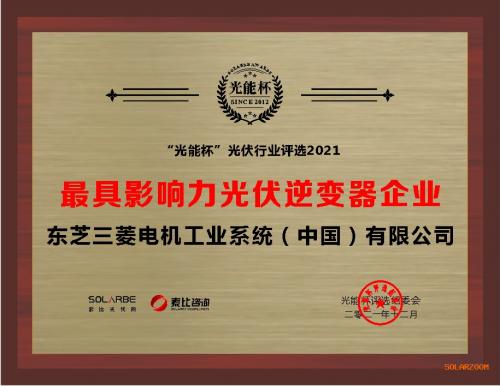2022年1月6日,东芝三菱电机工业系统(中国)有限公司(以下简称“TMEIC中国”)荣获Solarbe索比光伏网颁发的“光能杯” 2021年度最具影响力光伏逆变器企业奖,以表彰TMEIC中国对中国光伏行业的发展所做出的贡献。