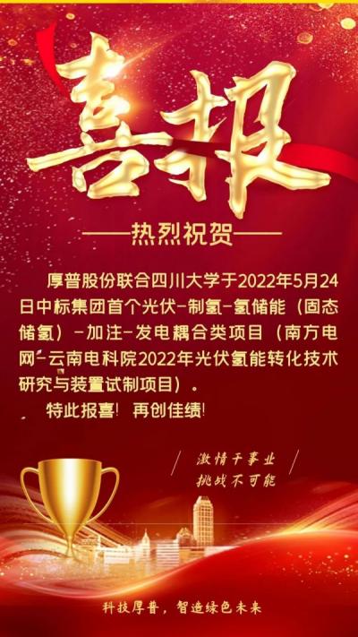 2022年5月24日,中国南方电网招标网发布中标通知书,厚普股份联合四川大学中标云南电网有限责任公司近期招标的“云南电科院2022年光伏氢能转化技术研究与装置试制项目”。其中,四川大学承担技术研究部分,厚普股份承担项目全部科研示范装备的试制工作,该项目预计2022年底完成。