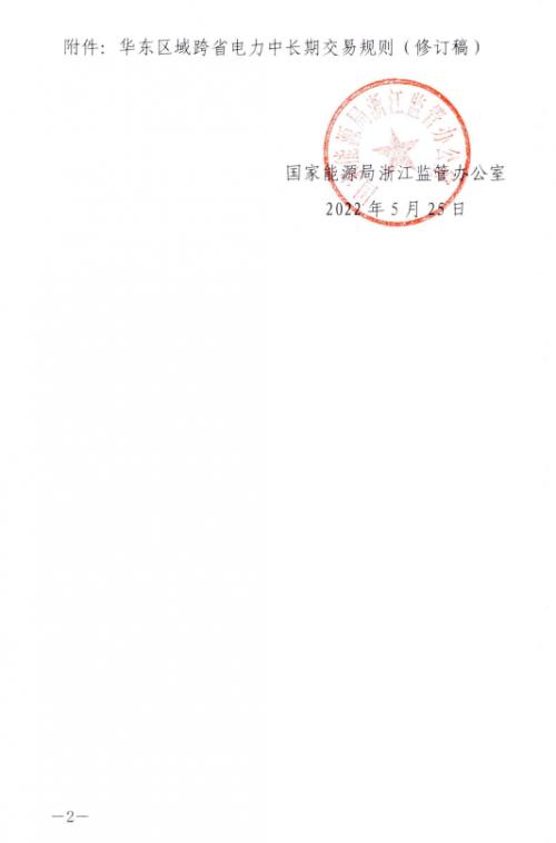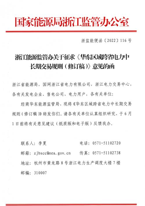5月27日,国家能源局浙江监管办公室发布关于征求《华东区域跨省电力中长期交易规则(修订稿)》意见的函,为规范华东区域跨省电力中长期交易,依法维护电力市场主体的合法权益,推进统一开放、竞争有序的电力市场体系建设,贯彻落实长三角一体化发展国家战略,制定华东区域跨省电力中长期交易规则,公开征求意见。
