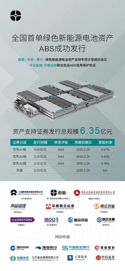 2022年5月31日,全国首单绿色新能源电池资产ABS——“蔚能-华泰-甬兴-绿色新能源电池资产支持专项计划(碳中和)”,在上海证券交易所成功发行。