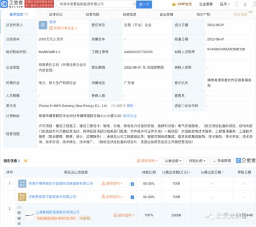 企查查APP显示:近日,珠海华发赛能新能源有限公司成立,法定代表人为陈伟,注册资本2000万元人民币,经营范围包含:太阳能发电技术服务;承接总公司工程建设业务;智能控制系统集成等。企查查股权穿透显示,该公司由珠海市横琴新区华金国际会展服务有限公司、深圳赛能数字能源技术有限公司共同持股,后者为电池龙头爱旭股份的全资子公司。