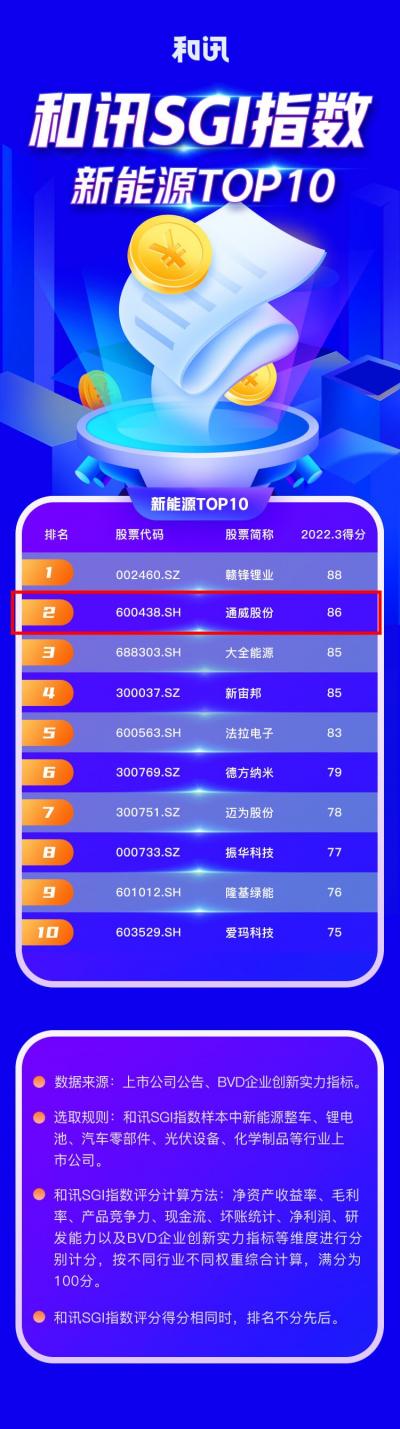 6月13日,由和讯金融投顾团队和媒体团队联合打造的和讯SGI指数2022年一季报榜单出炉。6月15日,最新和讯SGI指数2022年第一季度新能源TOP10榜单发布,通威股份位列榜单前三。