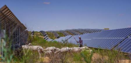 库布其310兆瓦电站创新性地将光伏发电与荒漠治理、农牧开发、助农扶贫有机结合,达到了经济效益、社会效益和生态效益大丰收。沙漠上覆盖的大片光伏板有效降低阳光与风力对土壤的负面影响,再结合微喷、滴灌技术,发展板下农业,大大提升了植物的存活率,为农牧产业打好基础。除了在内蒙古库布齐沙漠外,正泰还在宁夏、青海、甘肃等荒漠戈壁地带,建起了沙光互补地面光伏电站,不仅改善生态环境,更进一步帮助当地农牧民增收。