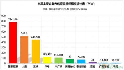 具体到本周的招标市场,国家能源集团以784.15MW,排名第一。大唐则以519.3MW位居第二。三峡以容量448.902MW,排名本周第三。
