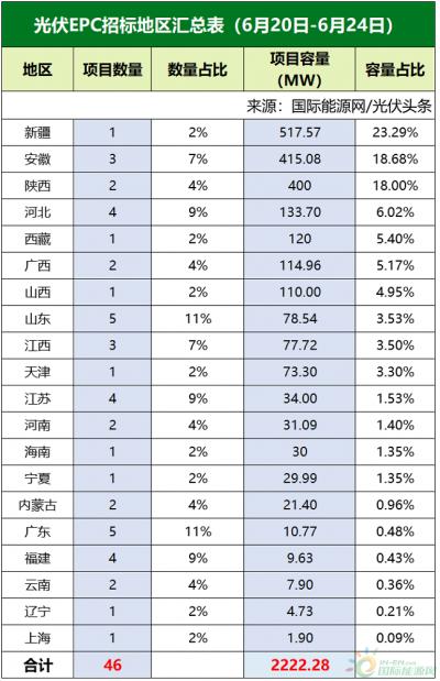 本周国家能源集团、大唐、三峡等企业发布了46个光伏招标项目,装机规模合计2222.28MW。