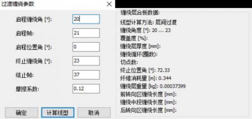 基于纤维缠绕物理摩擦模型和缠绕角连续变化原则,最典型应用是处理层间过渡的落纱点计算问题,如果在保持纤维轨迹稳定条件下计算出层间过渡的落纱点轨迹。层间过渡的典型应用是在确定摩擦系数条件下,如何计算出圆柱体上缠绕角α1连续缠绕到缠绕角α2的稳定轴向长度△L。圆筒段的非测地稳定过渡公式为: