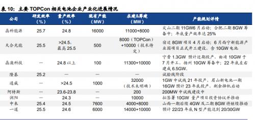 组件端龙头引领,TOPCon进入规模化量产元年,溢价下经济性初现,国海证券列举了各大龙头布局情况: