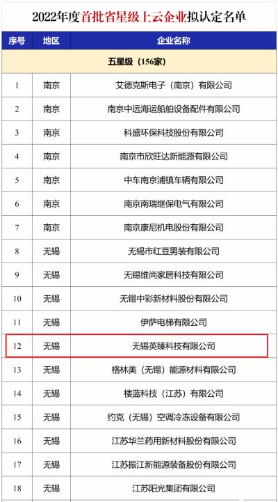 2022年度省重点工业互联网平台、省工业电子商务创新发展示范、首批省星级上云企业和省两化融合管理体系贯标示范企业培育对象拟认定名单已公示。无锡地区省星级上云企业(五星级)共18家,英臻科技名列其中。