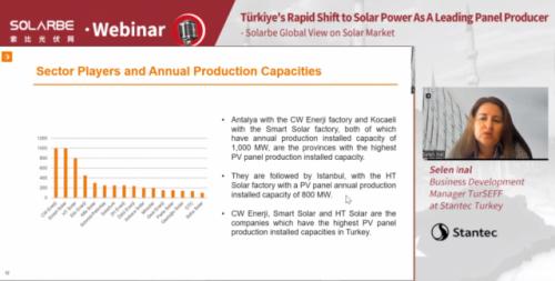 针对太阳能电池板的发展情况,伊娜介绍了当地制造商的发展和产能。其中,因为安塔利亚的CW Enerji工厂和科卡利的智能太阳能工厂,这两个省份的年装机容量都有1GW,是太阳能电池板装机容量最高的省份。根据她的介绍,目前市面上大约16家公司在2020年上半年将光伏板的生产能力提高到每年5.6GW,加上额外的产能,以及其他小企业和新入局公司,每年可达8GW。目前电池产能估计为每年1.13GW,硅片500MW,硅锭500MW。