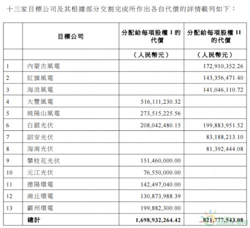 首批交割资产包括红旗风电、海南光伏、纯阳山风电、内蒙古风电、霸州环保、攀枝花光伏、白银光伏等在内的13家目标公司。另外还有余下10家目标公司股权收购在等待取得相关行政部分的批准。