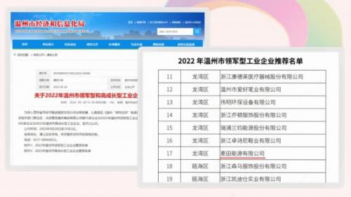 近日,随着浙江省温州市经信局发布的《关于2022年温州市领军型和高成长型工业企业推荐名单的公示》与《2022年温州市绿色低碳工厂和绿色低碳园区名单公示》两份文件顺利完成公示,麦田能源正式荣获温州市领军型工业企业与绿色低碳工厂两项殊荣。