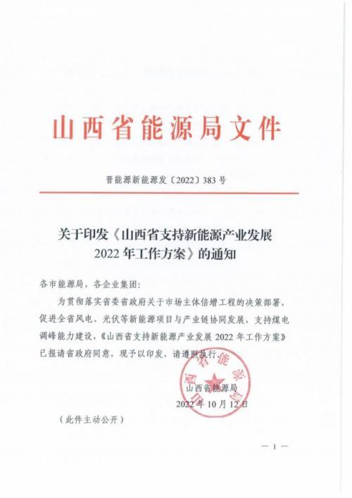 10月12日,山西省能源局印发《山西省支持新能源产业发展2022年工作方案》的通知,拟先行组织产业链发展安排规模申报3GW以及1GW煤电灵活性调峰改造配套风光项目。
