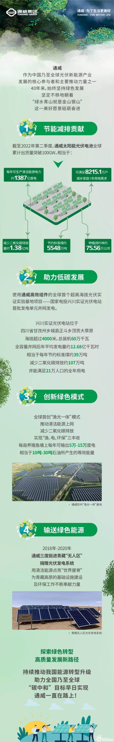 在新能源产业终端,通威全球首创“渔光一体”模式,每亩“渔光一体”池塘每年可输出5万至10万度电,每亩每年节约标准煤15吨以上,减少二氧化碳50余吨,环保效益不断凸显。