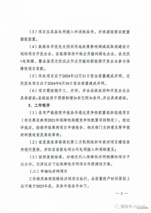 保障性并网规模项目,指完成可再生能源电力消纳责任权重所必需的新增并网项目,由电网企业实行保障性并网,全省安排保障性并网规模1000万千瓦,南网、北网项目配置储能规模分别不低于项目容量10%、15%,连续储能时长不低于2小时。分散式风电项目和地面分布式光伏发电项目(0.6万千瓦以下,不含屋顶分布式光伏发电项目),纳入年度保障性并网规模管理,占用各市申报规模,与集中式风电、光伏发电项目一同申报,申报原则、申报条件、时限要求、工作程序参照集中式风电光伏项目执行。