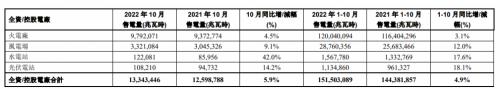 二零二二年前十个月附属电厂累计售电量达到151,503,089兆瓦时,同比增加了4.9%,其中,附属风电场累计售电量达到28,760,356兆瓦时,同比增加了12.0%;附属光伏电站累计售电量达到1,134,860兆瓦时,同比增加了18.1%