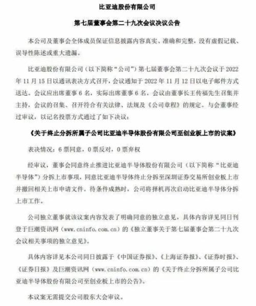 11月15日晚间,比亚迪突发公告,宣布终止推进控股子公司比亚迪半导体股份有限公司(比亚迪半导体)分拆上市事项,并表示待条件成熟时,将择机再次启动比亚迪半导体分拆上市工作。