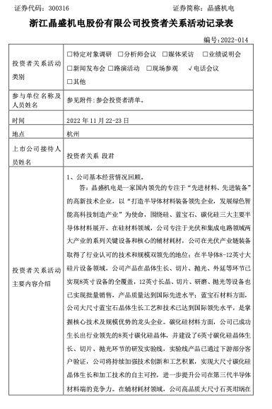 晶盛机电透露,截至2022年9月30日,公司在光伏领域的未完成晶体生长设备及智能化加工设备合同总计213.30亿元(含增值税)。