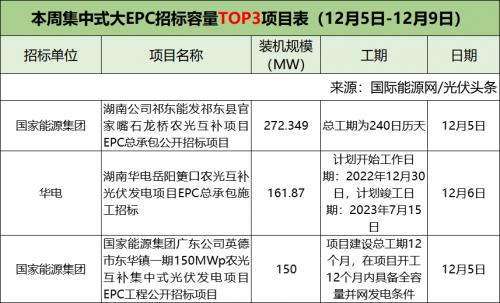 集中式大EPC项目有12个,其中,招标规模最大项目为国家能源集团湖南公司祁东能发祁东县官家嘴石龙桥农光互补项目EPC总承包公开招标项目。该工程装机容量为200MW,设计安装415800块655Wp单晶硅双面双玻光伏组件,直流侧装机为272.349MWp(可研暂定)。