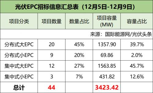 从本周招标项目类别来看,分布式光伏项目有29个,集中式光伏项目有15个,大EPC项目有32个,小EPC项目有12个。