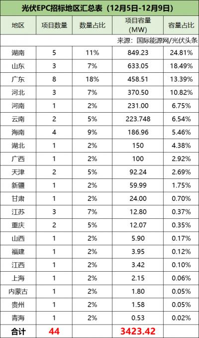 本周国家能源集团、中能国润(山东)能源科技有限责任公司、广东能源集团等企业发布了44个光伏招标项目,装机规模合计3423.42MW。