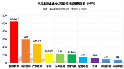 具体到本周的招标市场,国家能源集团以1054.07MW,排名第一。中能国润(山东)能源科技有限责任公司则以600MW位居第二。广东能源集团以容量489.20MW,排名本周第三。