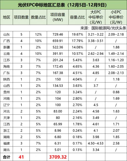 其中,分布式大EPC项目有20个,招标容量最大项目为中能国润(山东)能源科技有限责任公司山东省地区600兆瓦分布式光伏发电项目EPC工程总承包项目。该项目主要建设地点位于东营市、淄博市、济宁市,总建设容量600兆瓦。项目要求自接到招标人开工令之日起1185个日历天内整体工程通过综合验收并交付使用。