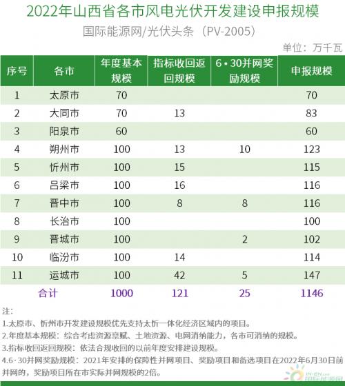 根据文件,山西省2022年“年度基本规模”保障性并网项目项目,合计规模为1046万千瓦,其中风电280万千瓦、光伏766万千瓦。分类型来看,保障性并网规模风电、光伏项目共计83个、规模922万千瓦;另外,各市确定的“指标收回返回规模”、“6*30并网奖励规模”项目15个、规模124万千瓦,不参与评审,以各市申报为准。